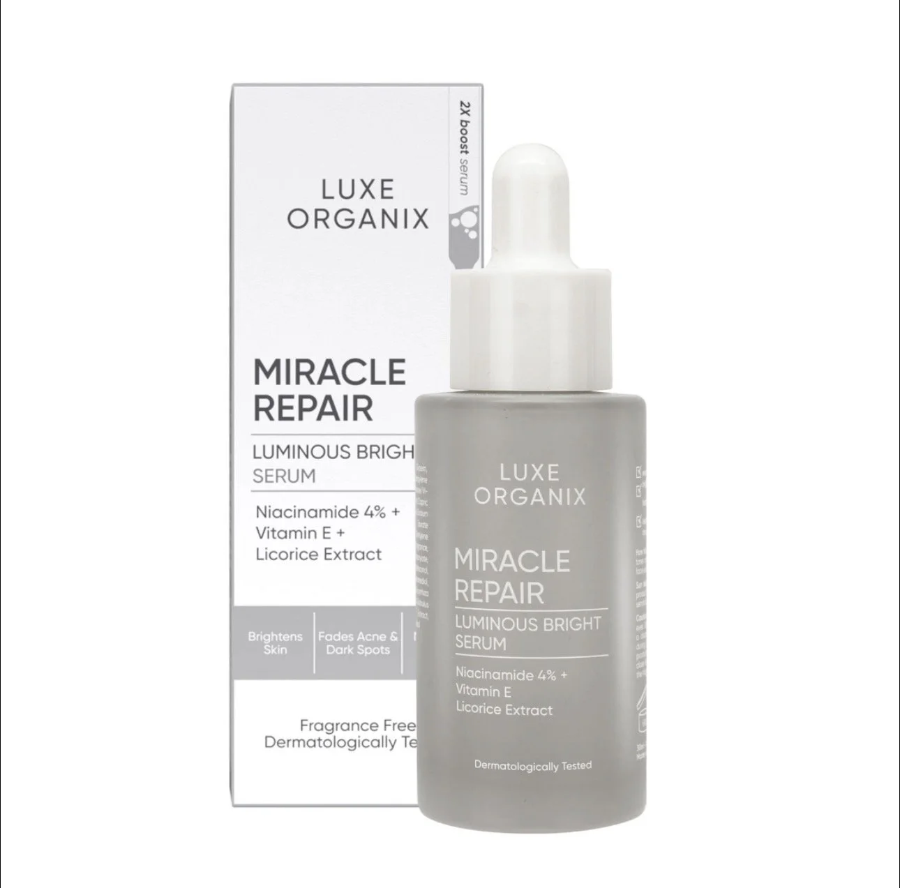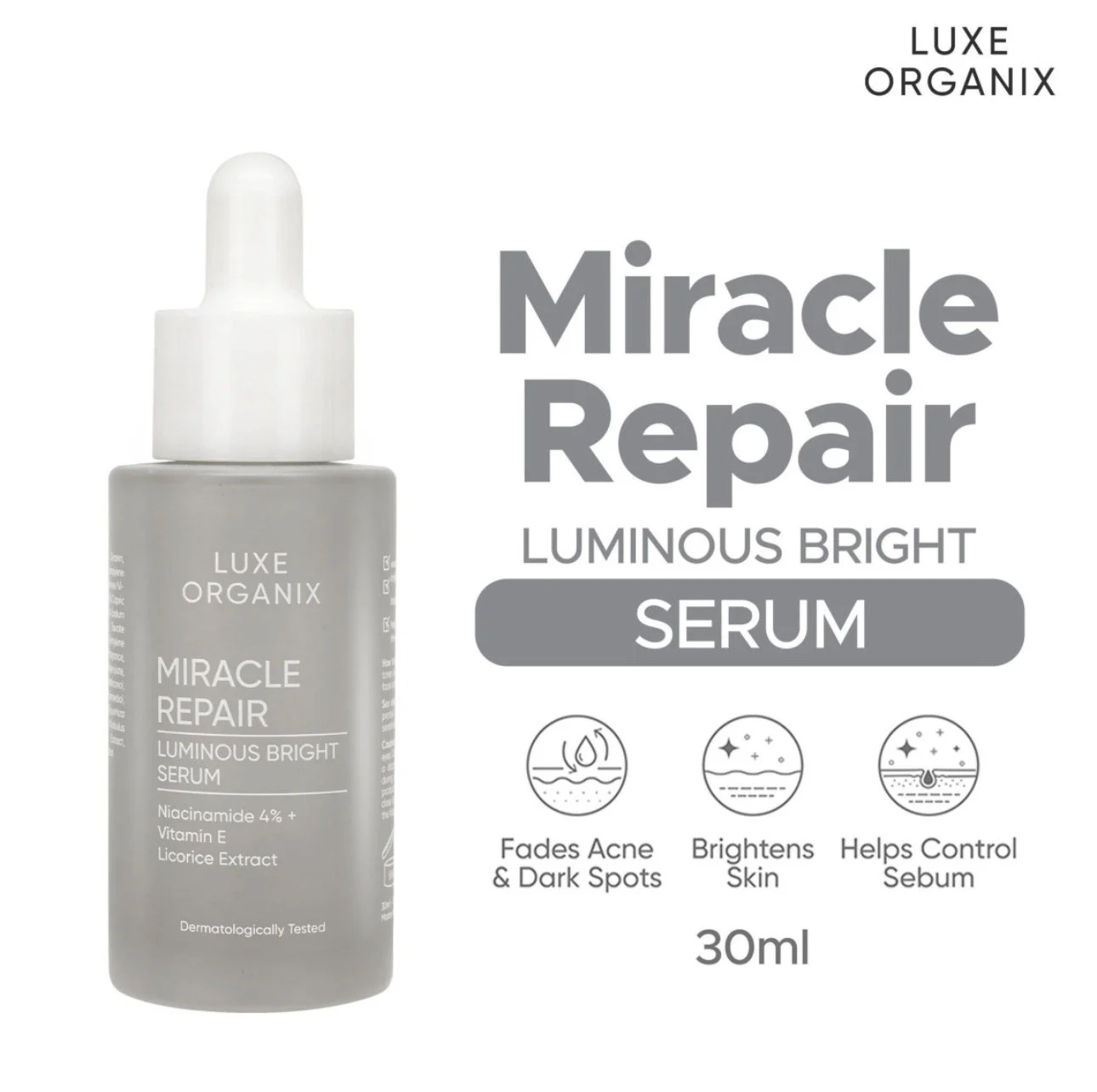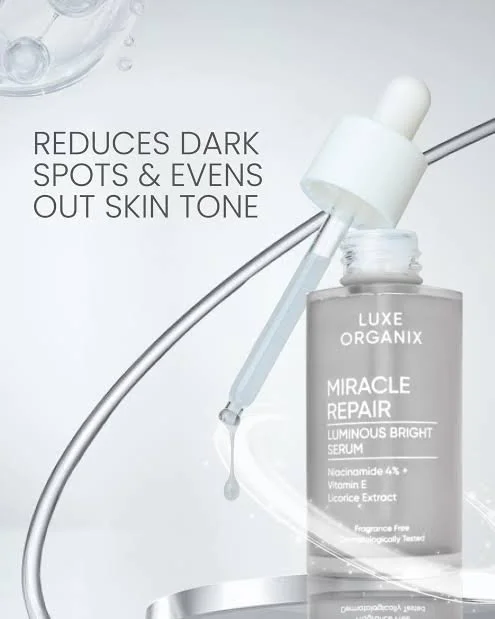Luxe Organix Miracle Repair Luminous Bright Serum, a concentrated skincare treatment designed to brighten the skin, fade hyperpigmentation, and minimize shine.