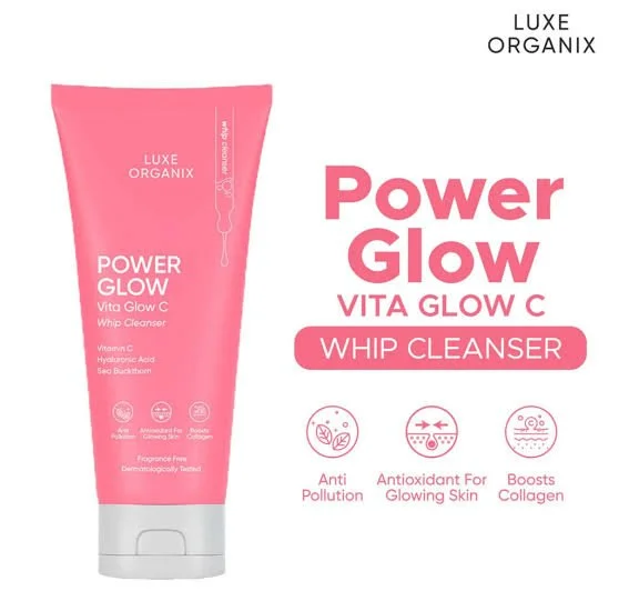 Luxe Organix Power Glow Creamy Whip Cleanser cleanses face without the stripping feeling. Developed with Galactomyces Ferment Filtrate and Vitamin C to reduce signs of aging. It promotes a brighter complexion by reducing impurities and increasing collagen production, revealing a healthier glow.
