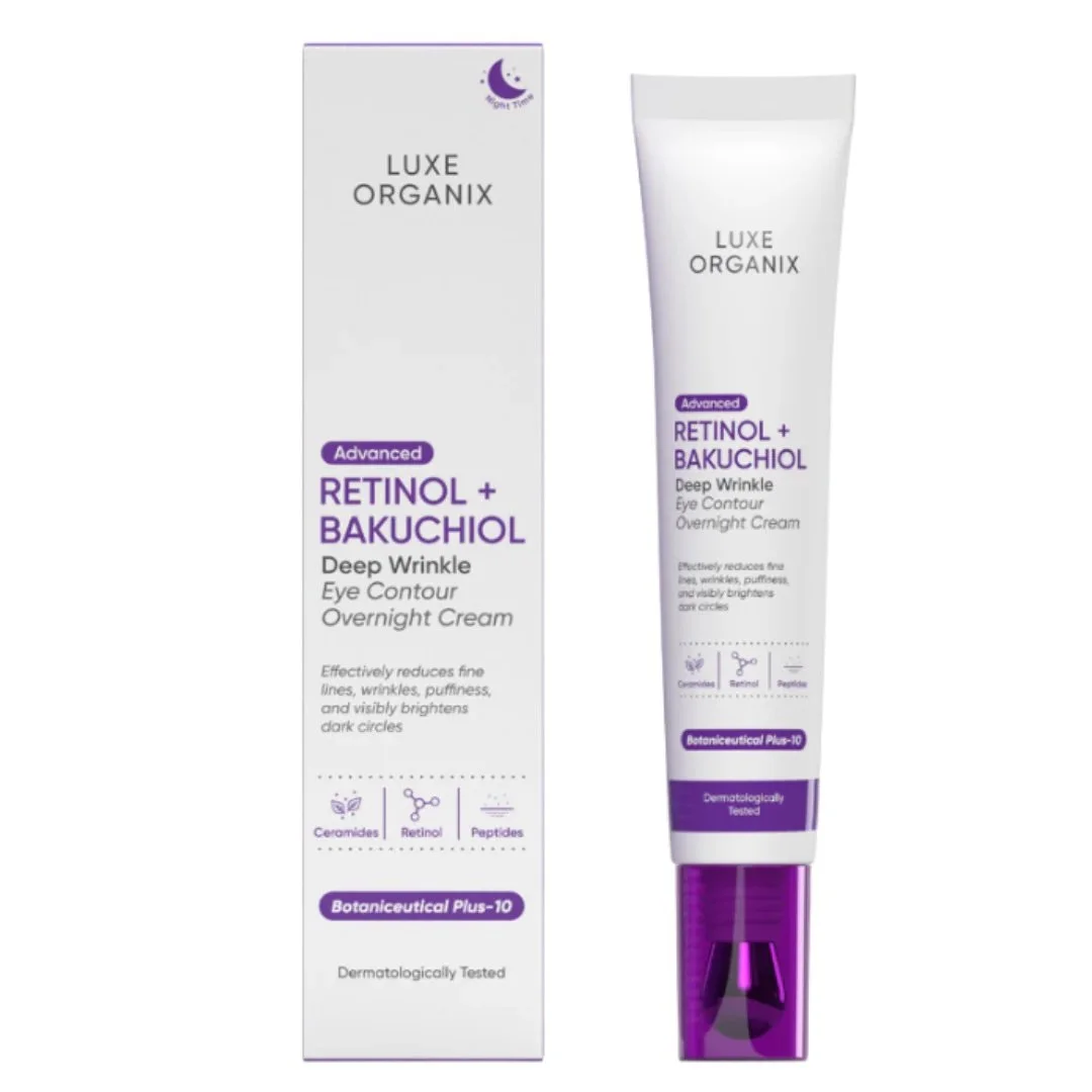 LUXE ORGANIX Advanced Retinol + Bakuchiol Deep Wrinkle Eye Contour Overnight Cream, an anti-aging treatment designed for the delicate skin around the eyes.