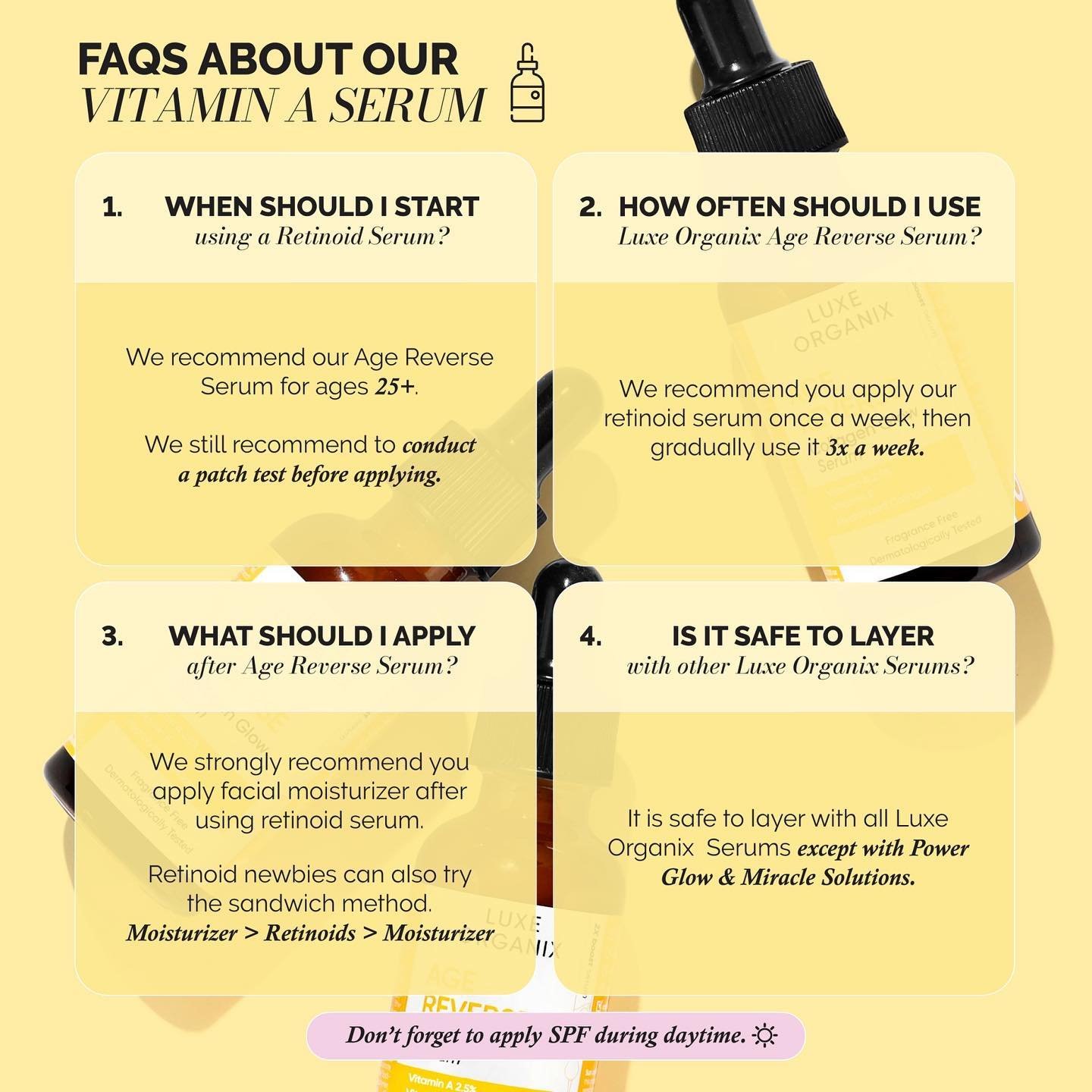 Sun alert: Always wear sunscreen when using this product during day time as it increases sun sensitivity.