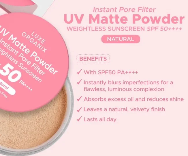 Luxe Organix 24h Zero Sebum Instant Pore Blurring Matte Powder delivers professional-grade oil control with its weightless formula that absorbs excess sebum throughout the day. The translucent loose powder provides SPF 50 PA***+ protection while simultaneously minimizing the appearance of pores and fine lines. Its sophisticated mattifying technology creates a velvety, natural finish without caking or settling into creases. Ideal for setting makeup or wearing alone, this dermatologically-tested powder ensures a flawless, shine-free complexion that maintains its integrity in various environmental conditions.