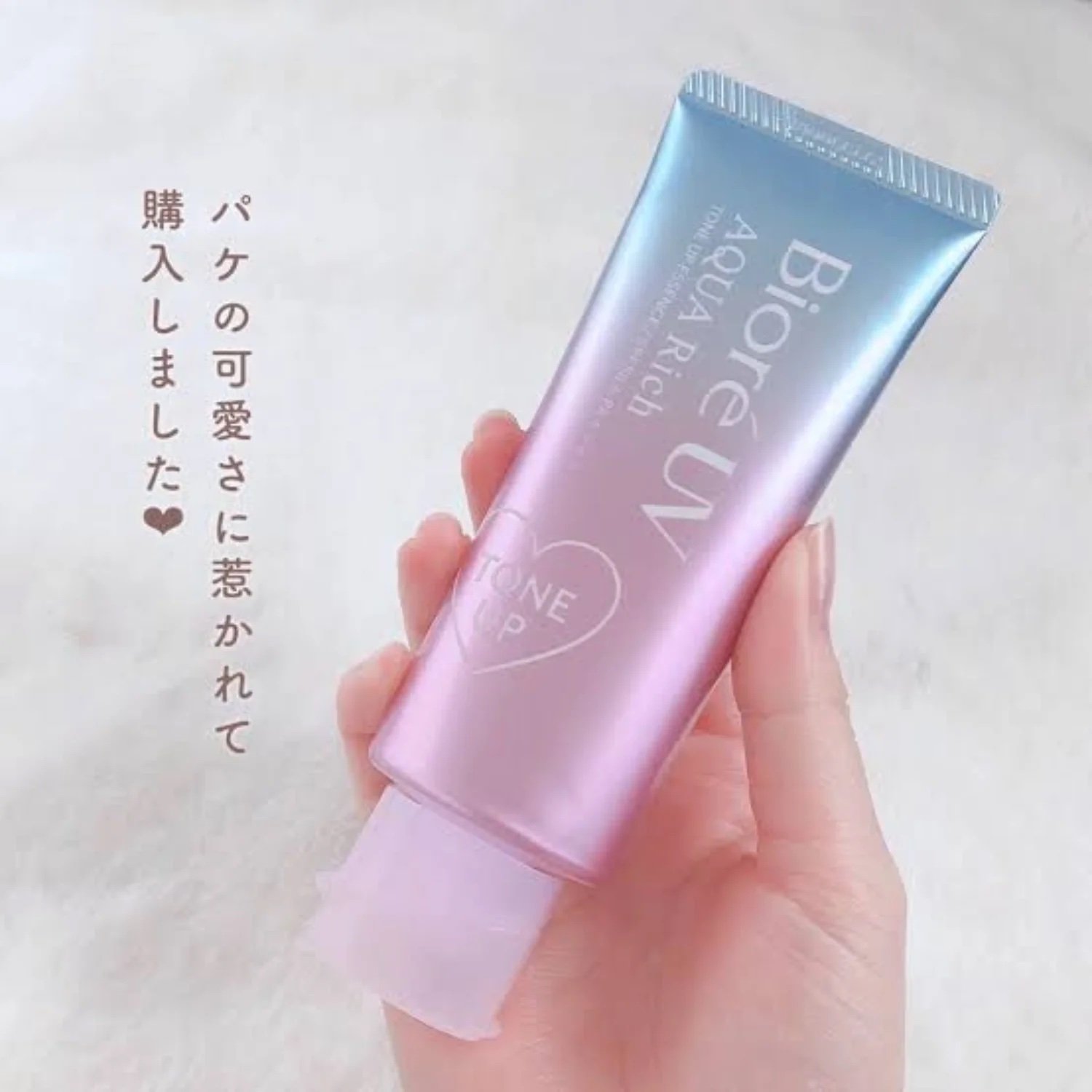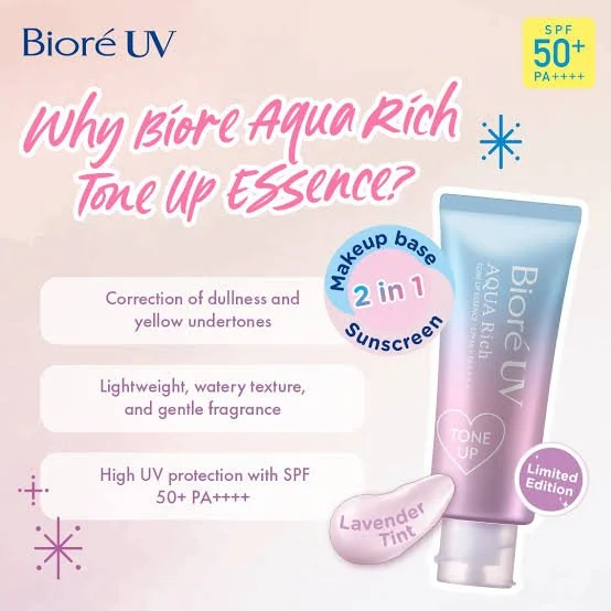 Bioré UV Aqua Rich Tone Up Essence (Lavender Color). It is a multi-functional Japanese sunscreen that combines high-level UV protection with skin-brightening and moisturizing benefits.